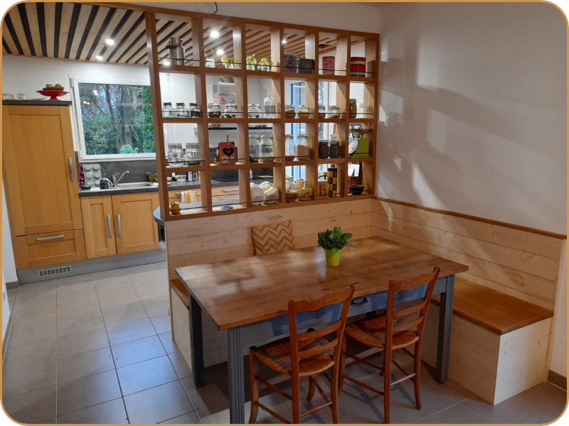 Je réalise notamment des cuisines sur mesure, dressings, bibliothèques et différents aménagements intérieurs, fabriqués principalement en bois massif et adaptés aux besoins de chaque projet.
