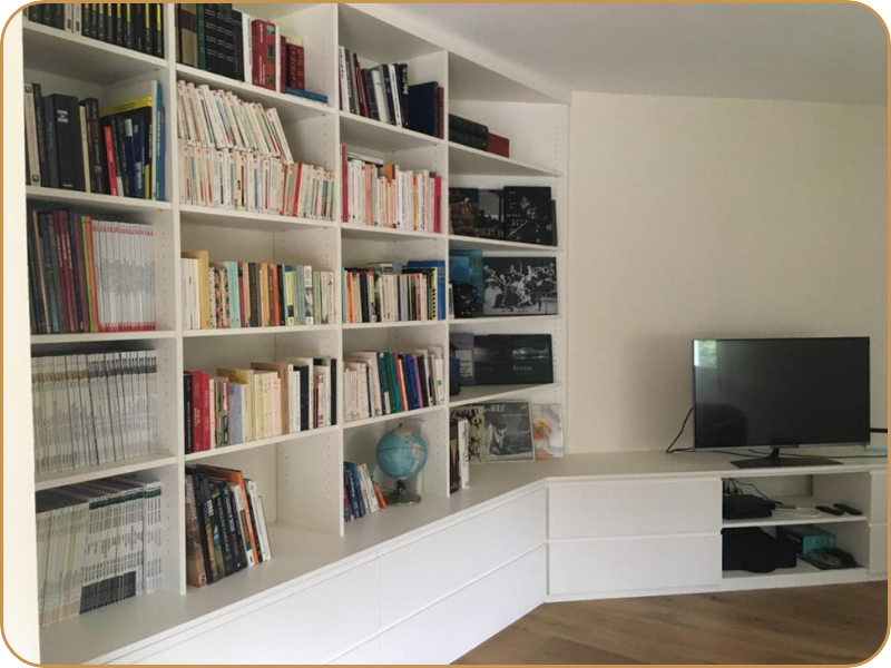 Une bibliothèque sur mesure permet de s’adapter parfaitement aux dimensions de votre pièce et au style de votre intérieur. Elle peut occuper un mur entier, encadrer un espace ou s’intégrer dans une niche afin d’optimiser l’aménagement de votre pièce.